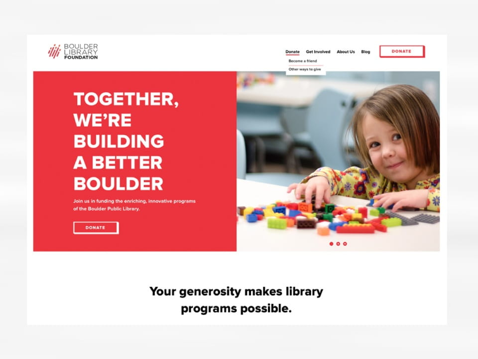 Our team was responsible for the overall visual identity of the Boulder Library Foundation keeping the goal of preserving the 30+ year heritage of the Foundation intact. We also designed and developed their website using Wordpress and integrated the site into Kindful as their CRM.