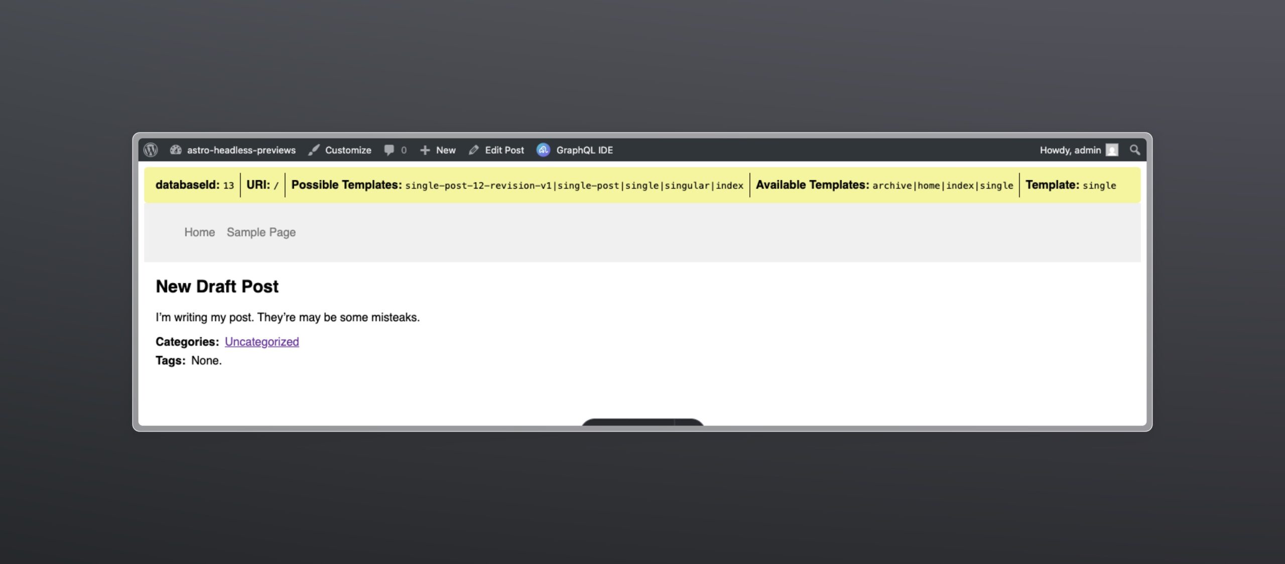 WordPress doesn’t assign a URI to a post until after it has been published. This means drafts and scheduled posts don’t have a dedicated URI. They may have a slug, but this isn’t necessarily unique in WordPress land. Thus, to correctly render previews, we must handle routing and data fetching based on the databaseId, not the URI. This will come up in several ways later, but for now, know that this is a constraint of WordPress we must adapt to.