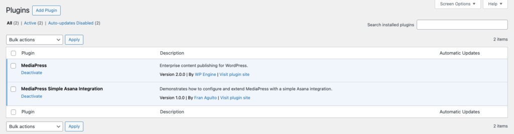 4. The next plugin you will need is the simple example extension I created for the Asana connection. We will need to add the plugin extension to our WordPress install. Grab the code here from this repo. Clone the repo directly into your /wp-content/plugins/ directory. It lives in the mediapress-simple folder. Once you have this added to your WP install, You should see the plugin within the dashboard. You can go ahead and activate it.