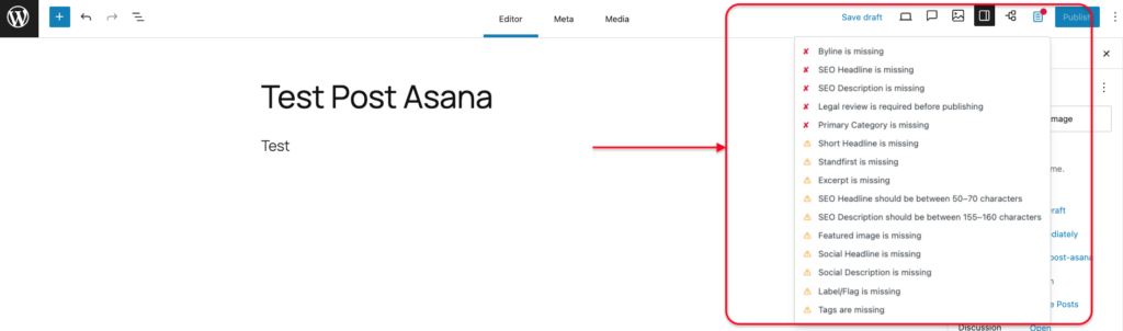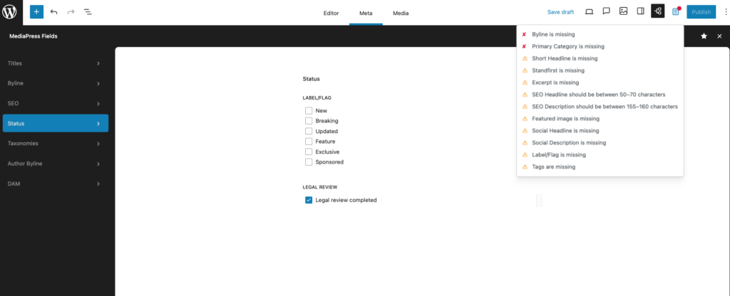 In WordPress, WP Engine’s Newsroom features the Publication Checklist. It is a customizable quality-control tool that ensures all editorial standards are met before a story goes live.