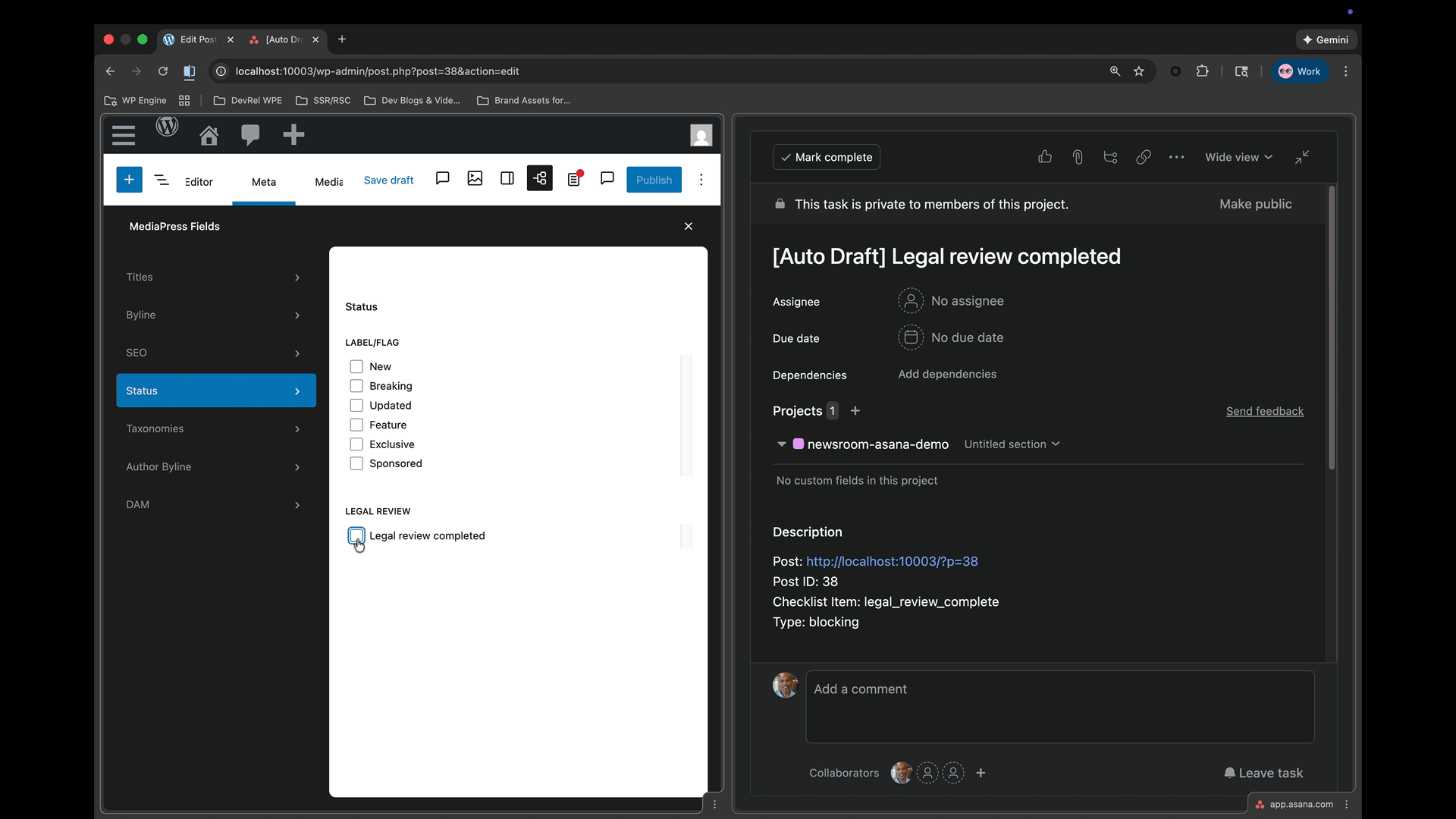 - Asana behavior: Will create a task that marks complete when the legal review meta is set.