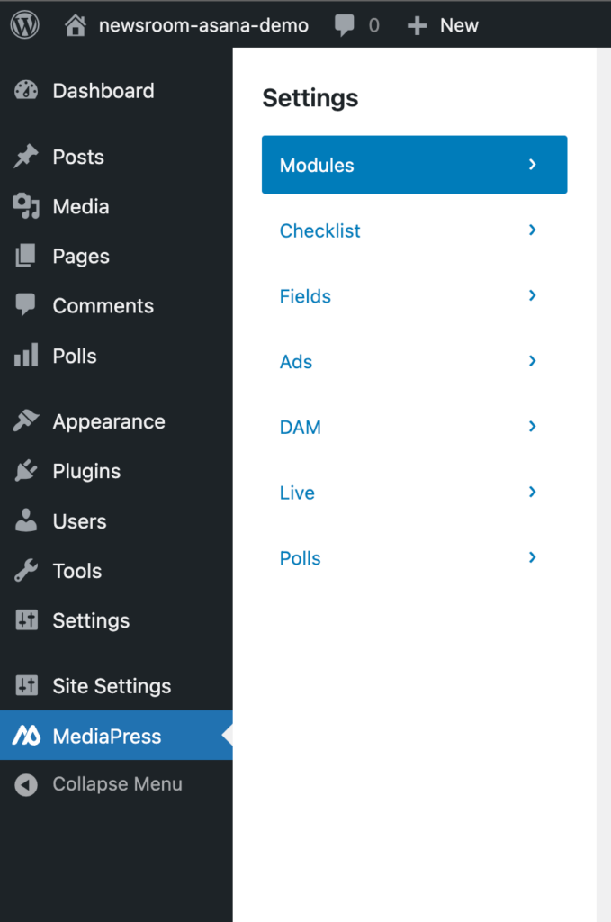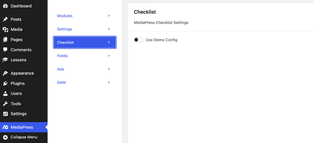 In the WP admin sidebar you will see the MediaPress option. Select Checklist and make sure that the Use Demo Config option is toggled off. This will allow you to use the simple example instead.