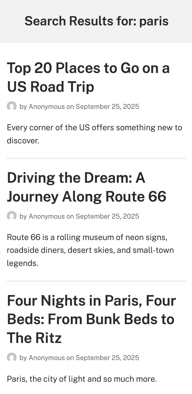 After applying a license to a site and running the initial content sync, WP Engine Smart Search takes over the default WordPress search functionality and serves all the site’s search content.