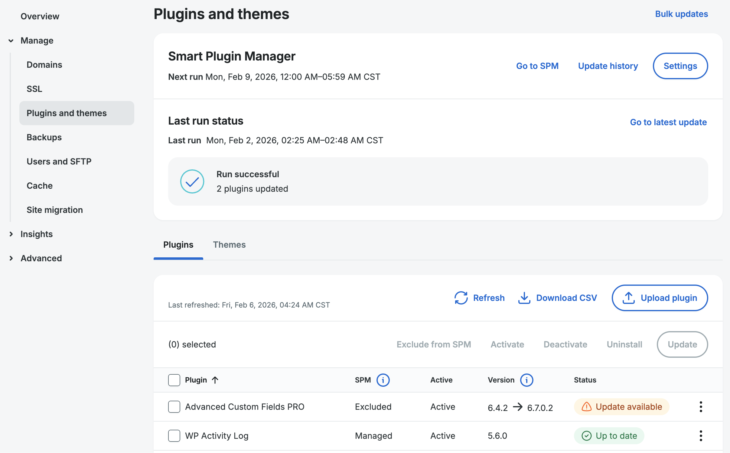 For accounts with access to Bulk Updates, there are also update features including new Add plugin and Add theme buttons.