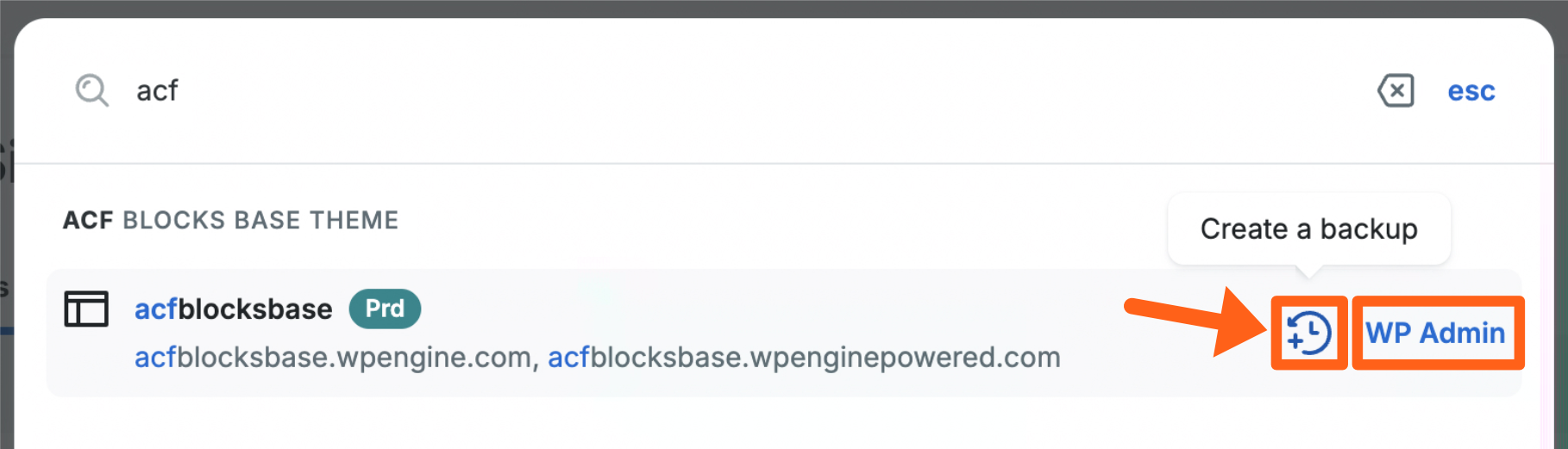 The search results in the Omnisearch window now have quick actions next to each environment. The quick actions for the environment include a link to the WordPress admin dashboard, and a button to create a backup.