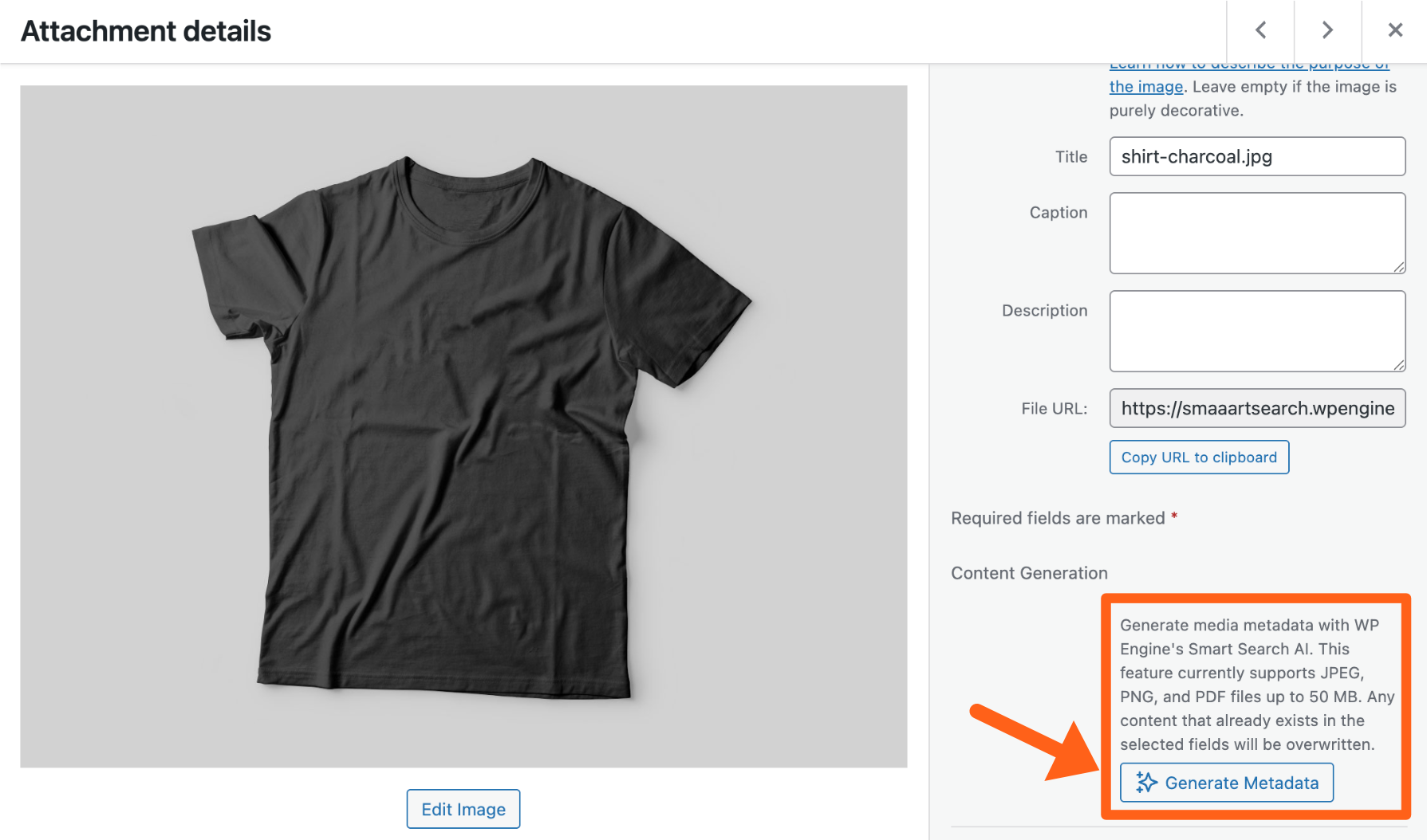 - Once the image is selected in the media library, scroll down in the image details sidebar and click the Generate Metadata button.