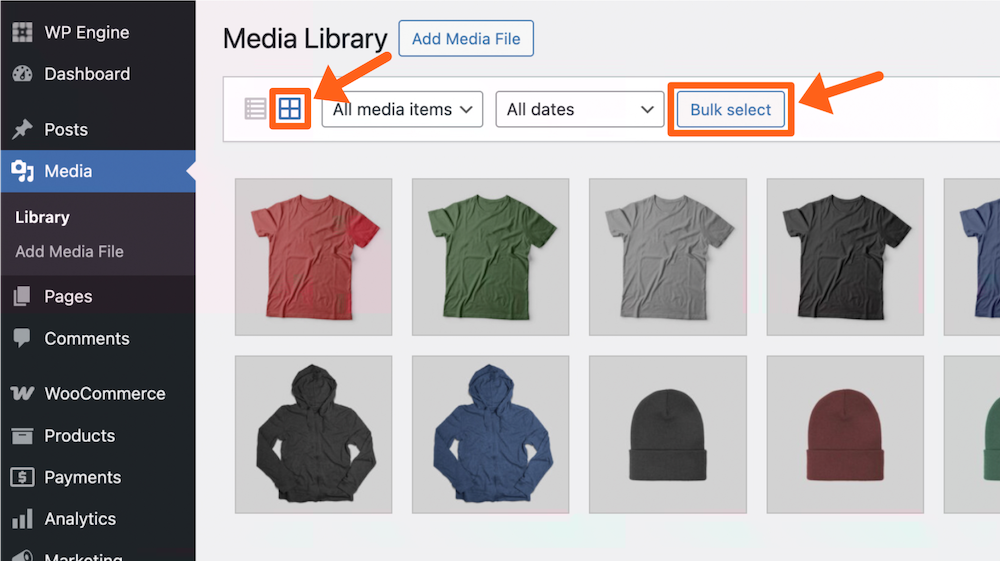 - Click on the thumbnail for each media item that you want to edit in bulk. You’ll see a checkbox on each selected item.