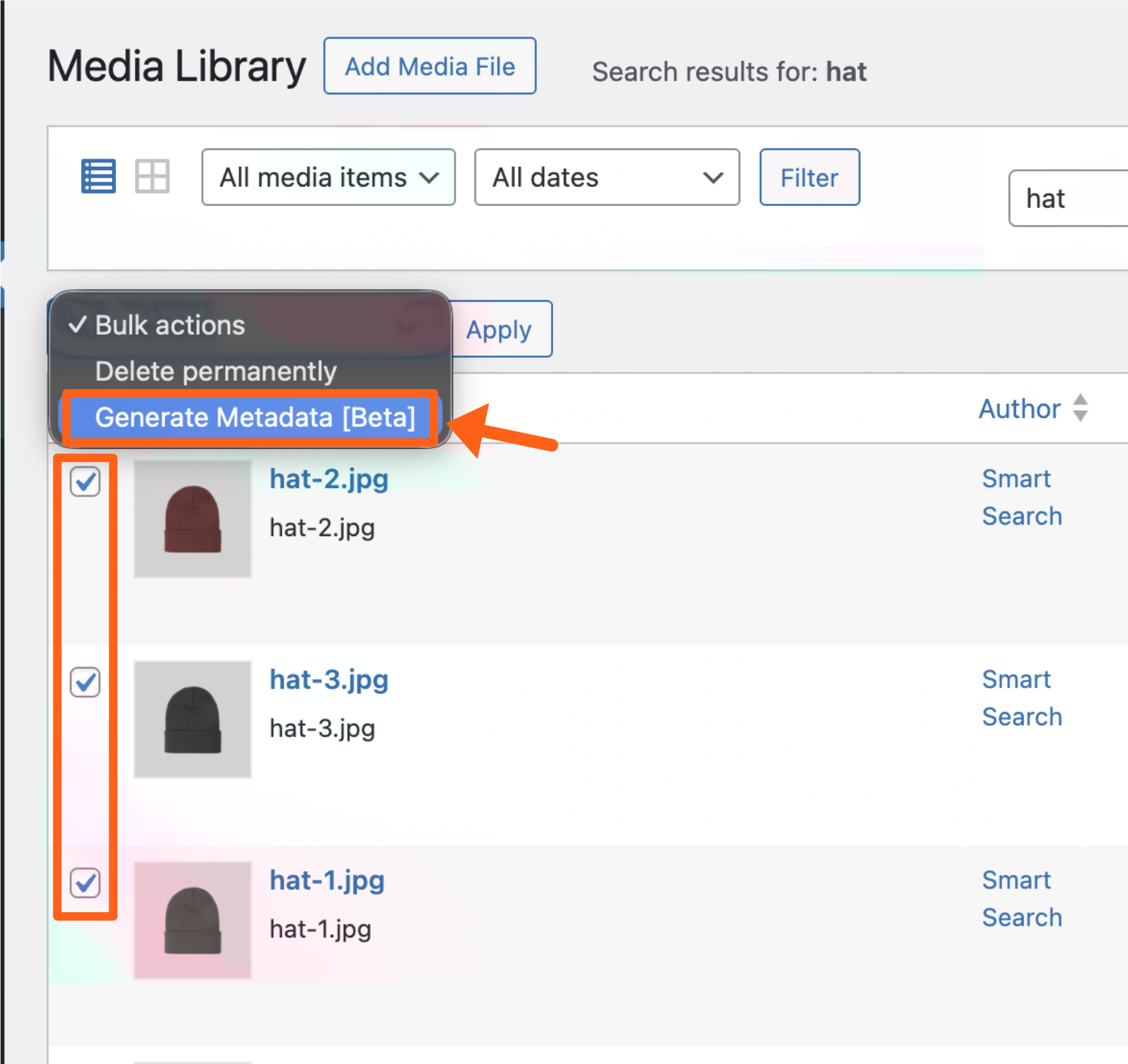- Click on the Bulk actions dropdown at the top left of the table, and select the Generate metadata option. Then click the Apply button to the right of the bulk actions dropdown.