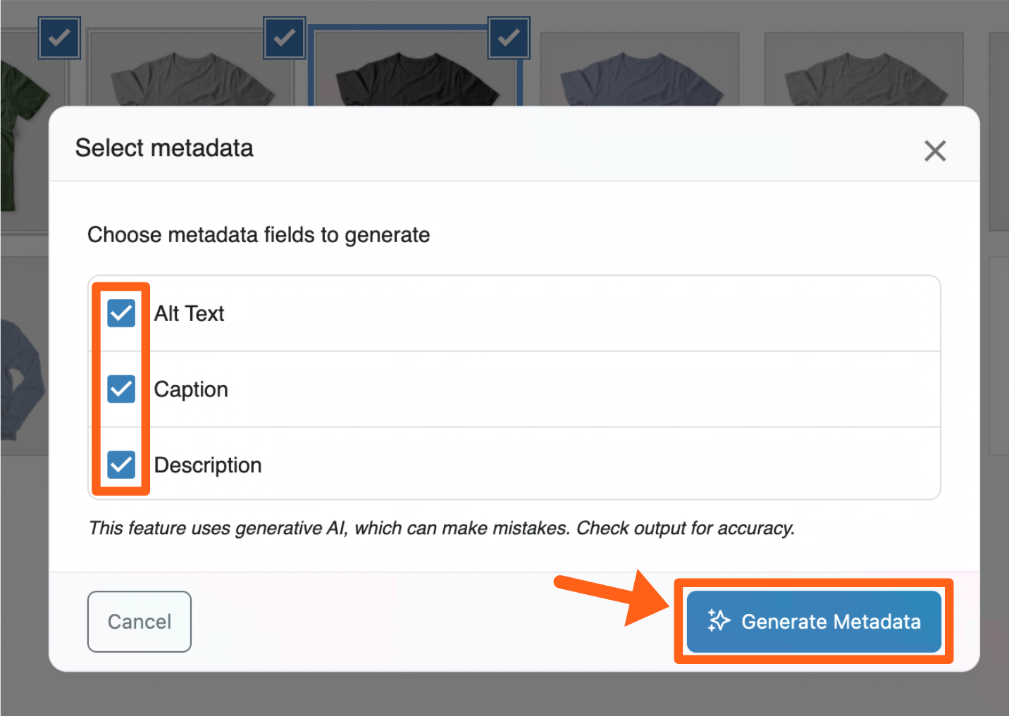 - In the popup window, select the metadata fields that you want to be generated for the selected media items. The options are Alt text, Caption, and Description (Description is the only field that will be generated for PDFs).