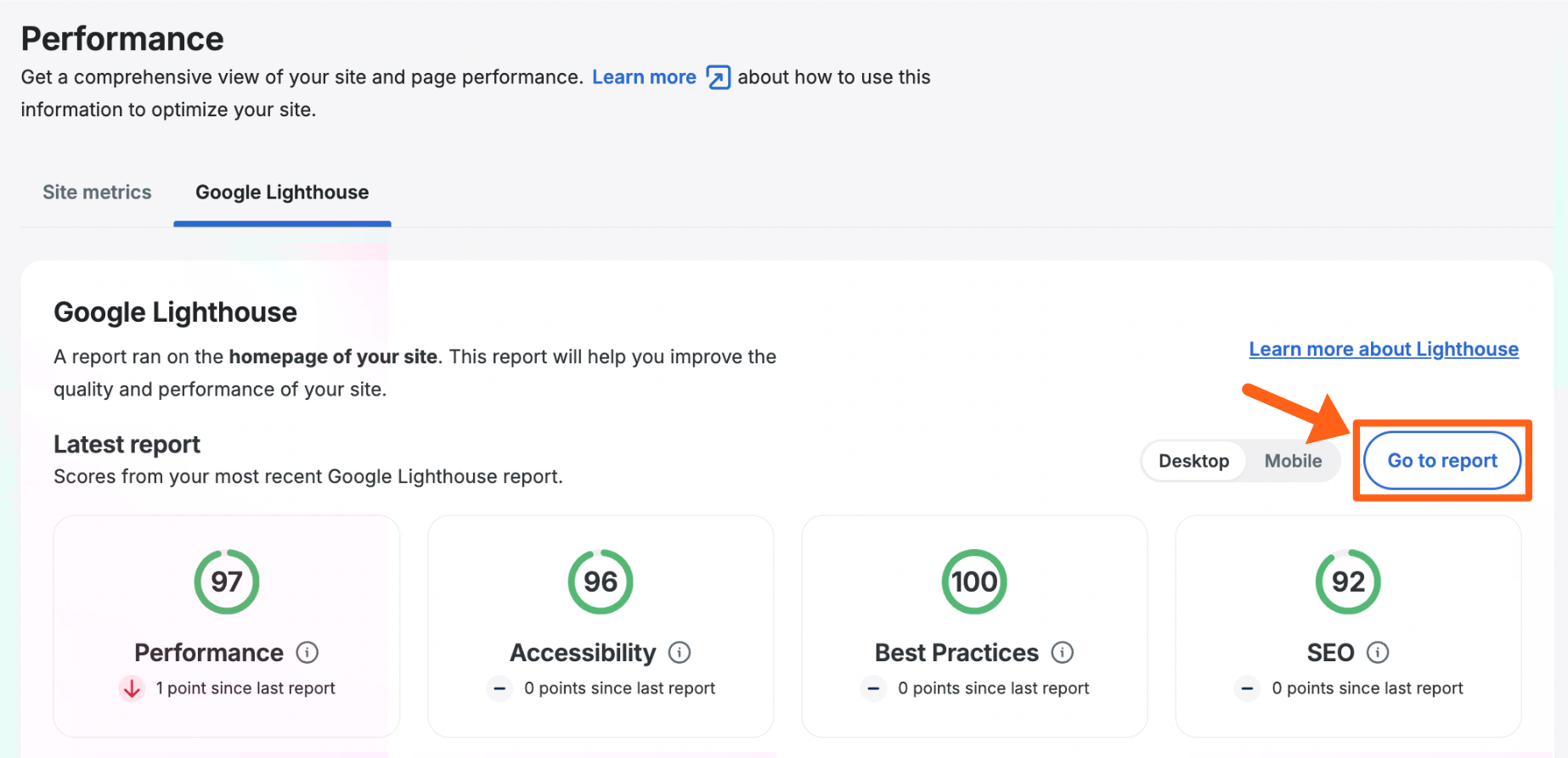 To view more details about the scores from the most recent report, click on the Go to report button in the top right.