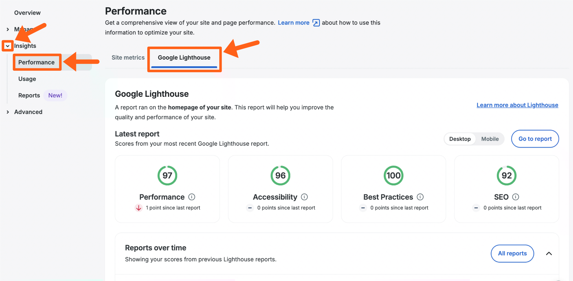 - Click Performance in the secondary lefthand menu (You may have to expand the Insights dropdown section)