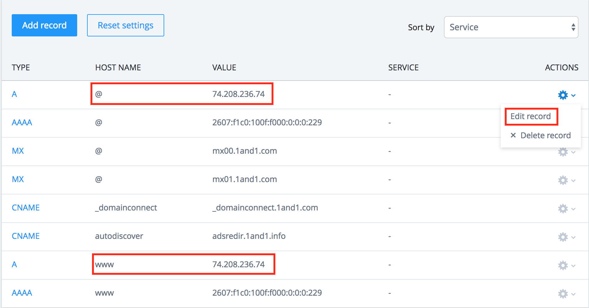- Configure the first A record: