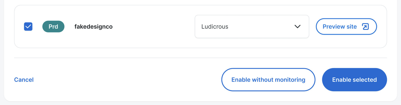 - Choose your enablement option. You have the option to choose whether you want to enable Google Lighthouse score monitoring during this step. You can change this later for each environment from the NitroPack product page later if you change your mind. If you don’t want Google Lighthouse score monitoring, then click the Enable without monitoring button. If you do want Google Lighthouse score monitoring then click the Enable selected button.