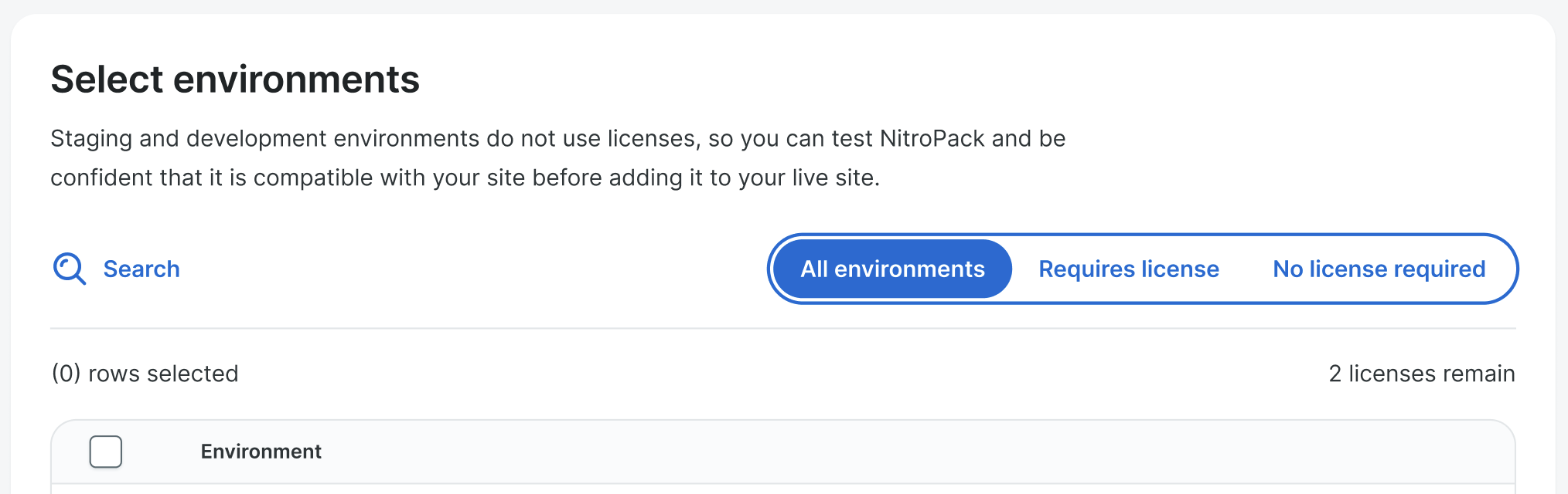 - (Optional) It’s recommended to test NitroPack on a Staging or Development environment before applying it to Production. Click No license required to view Staging and Development environments. Note that the performance benefits on Stg/Dev will not be as great, and testing here should simply be done for overall compatibility with the Production environment. NitroPack must be purchased for the account before the No license required option will be available.