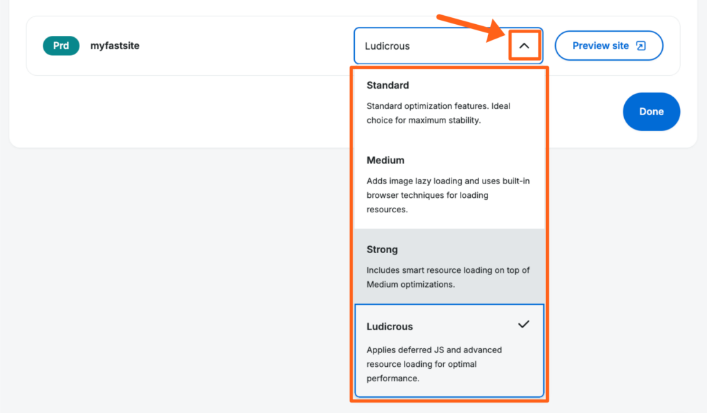 - Expand the dropdown to and select one of the other optimization modes. This will make some changes that might work better for the site.