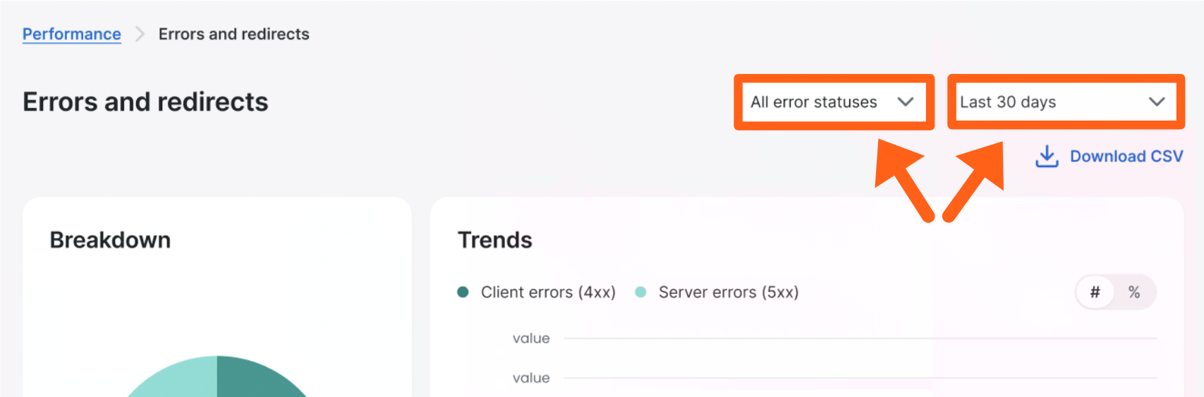 - Status codes – Choose from “All status codes”, or from status codes in the 300, 400, and 500 ranges (3xx, 4xx, 5xx). If you select a specific range such as 5xx, then you will see a further breakdown of error codes in that range.