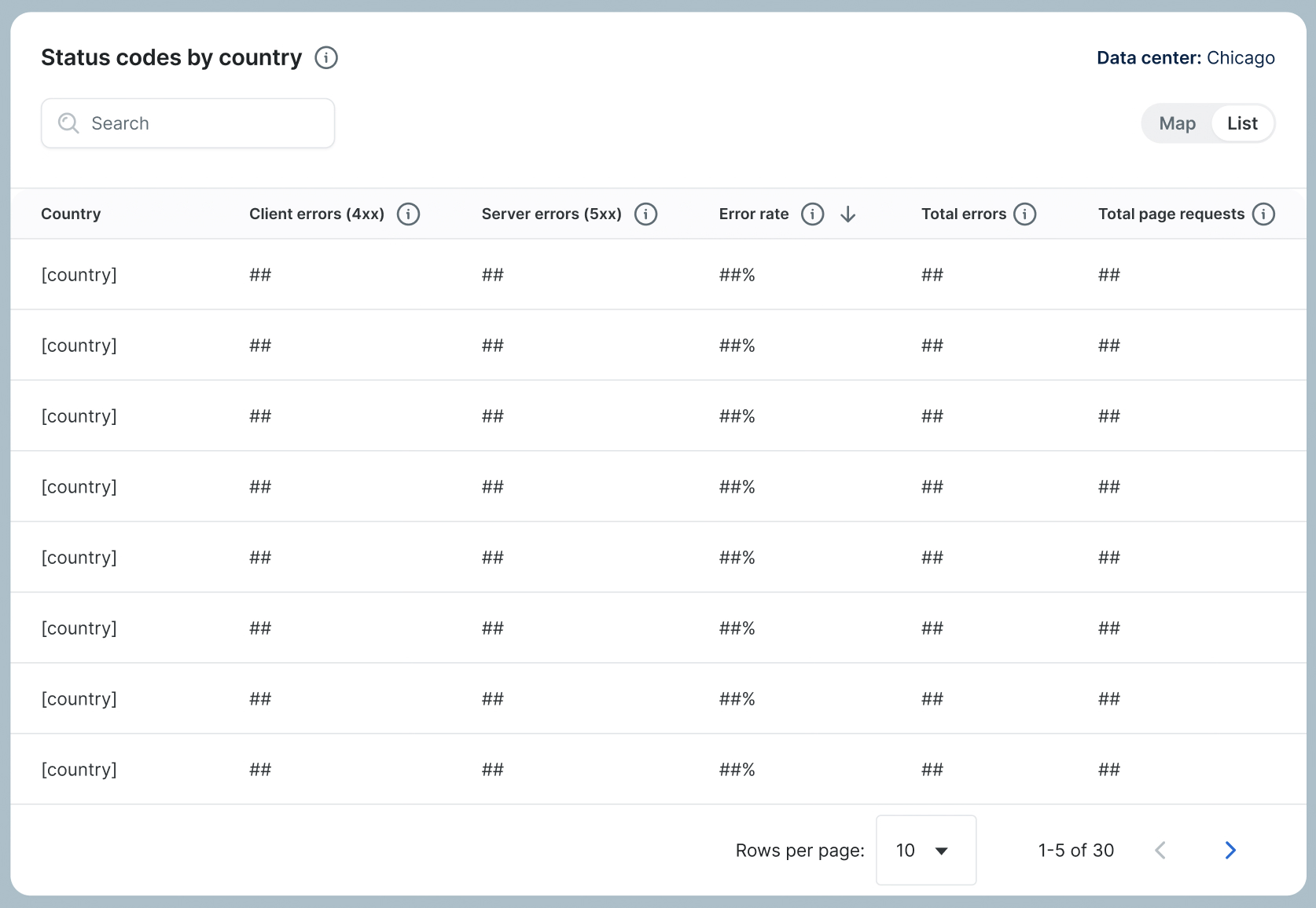 The status codes by country section shows an overview of status codes for each country with a map view and a table view. To switch between the map and list views, use the toggle button in the top right.