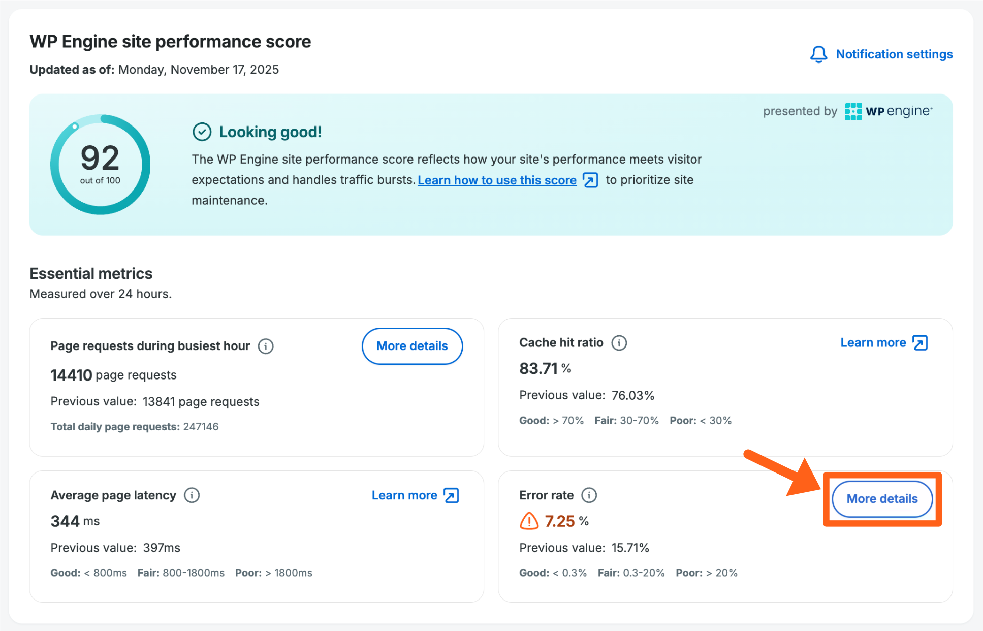In order to determine your WP Engine site performance score we generate an underlying latency score and cache score over a 7-day look back period, and combine those metrics into a single value.