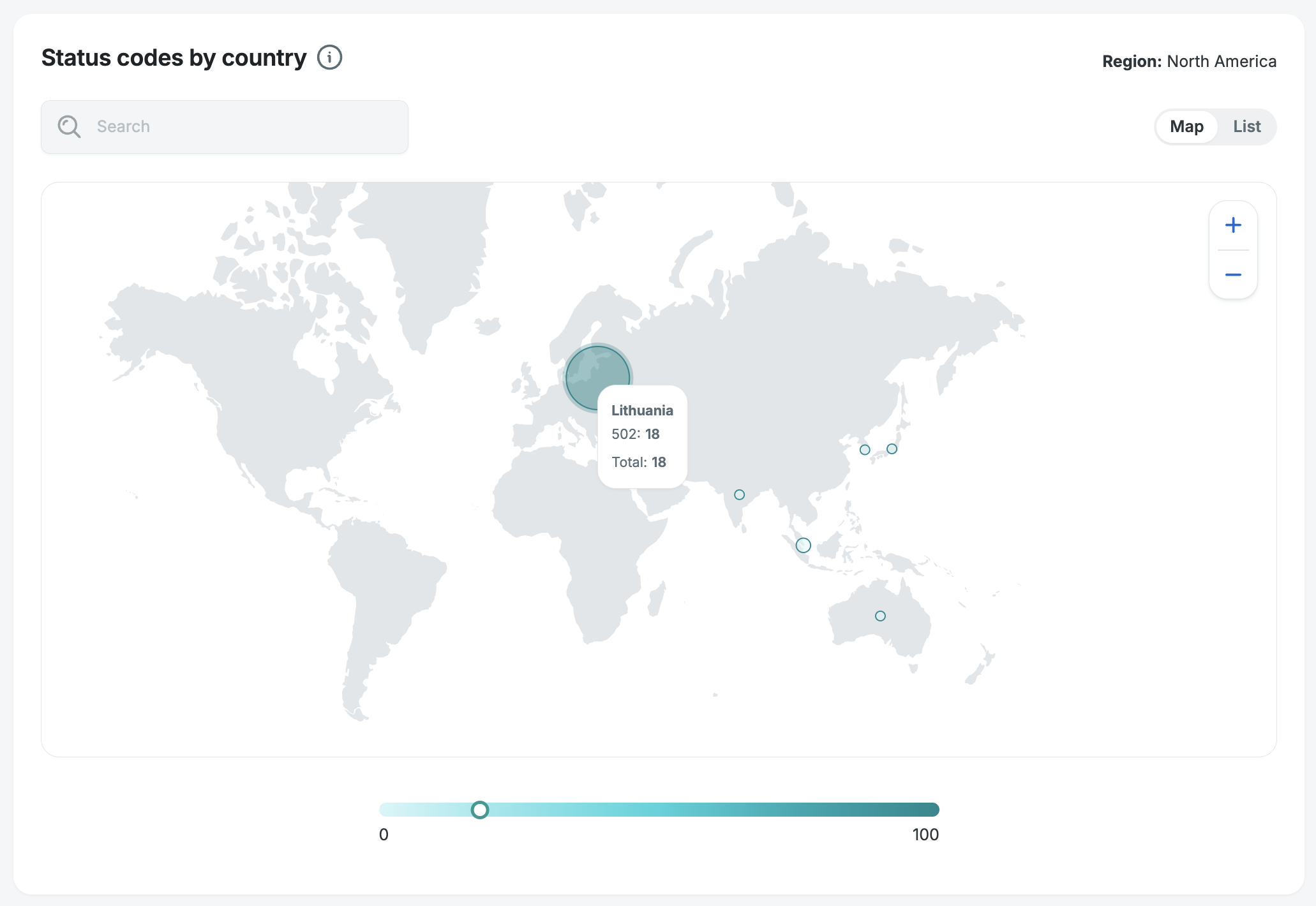The status codes by country section shows an overview of status codes for each country with a map view and a table view. To switch between the map and list views, use the toggle button in the top right.