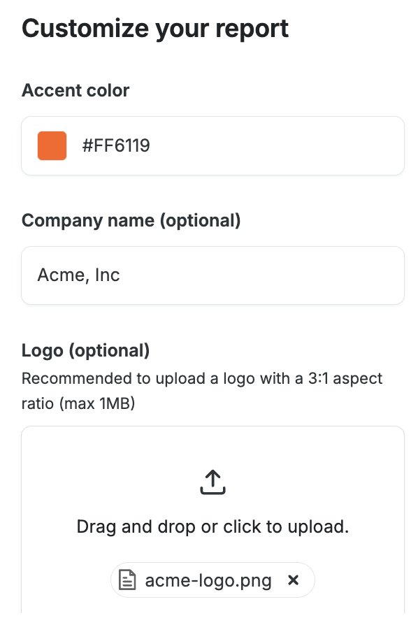 - Accent color: Input a HEX color for the accent color of your report. This color will be used as the background color for the coversheet.