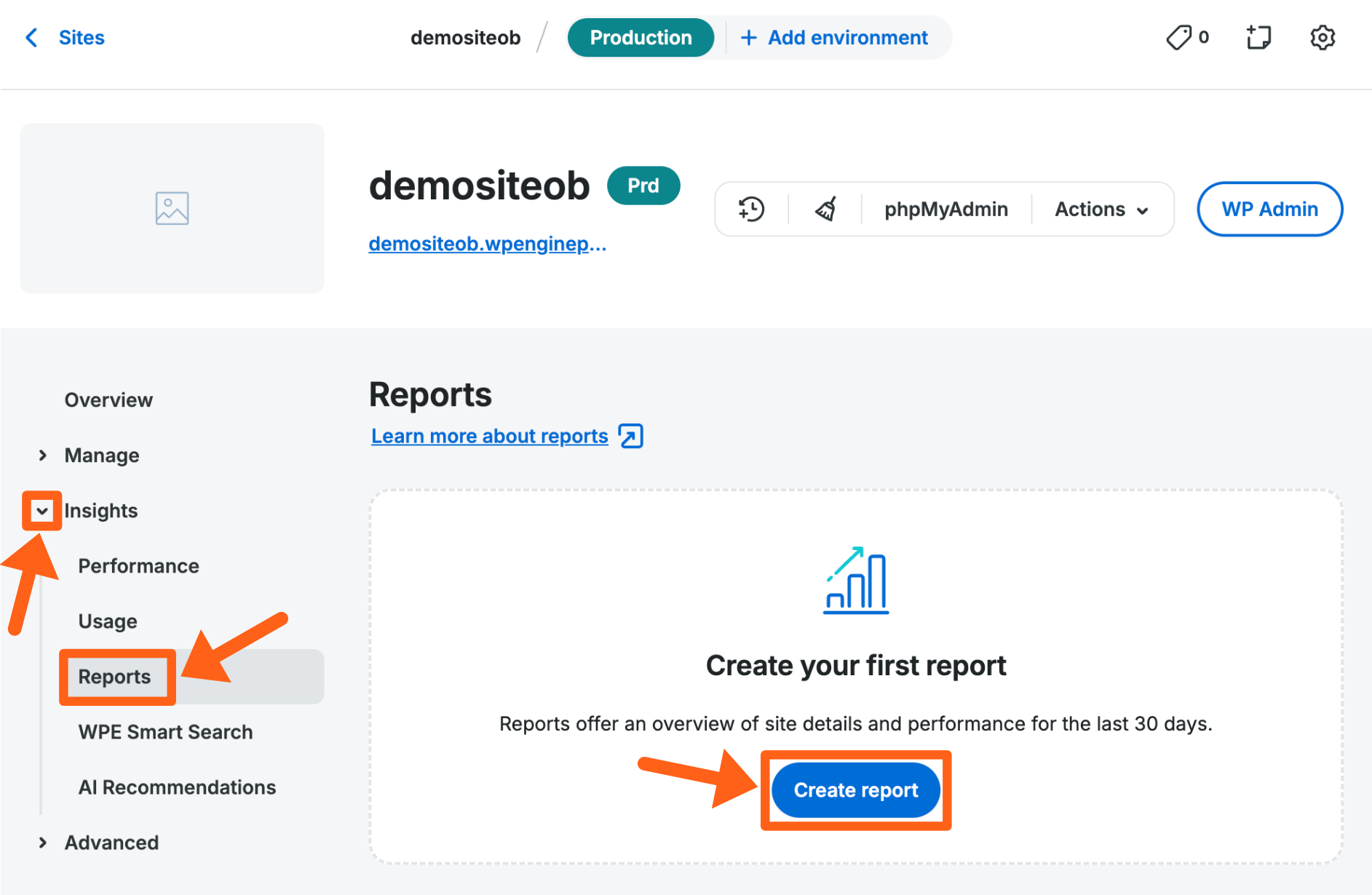 The Site Report tool for an environment can be accessed in the WP Engine User Portal by all users who have access to the given environment.