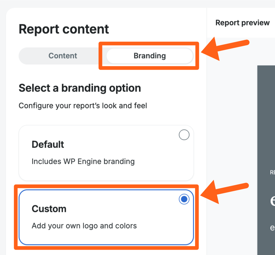 The option to add custom branding to your reports is now available for Owner and Full users on WP Engine premium (Core and Enterprise) and agency accounts. You can now specify an accent color, a company name, and a logo.