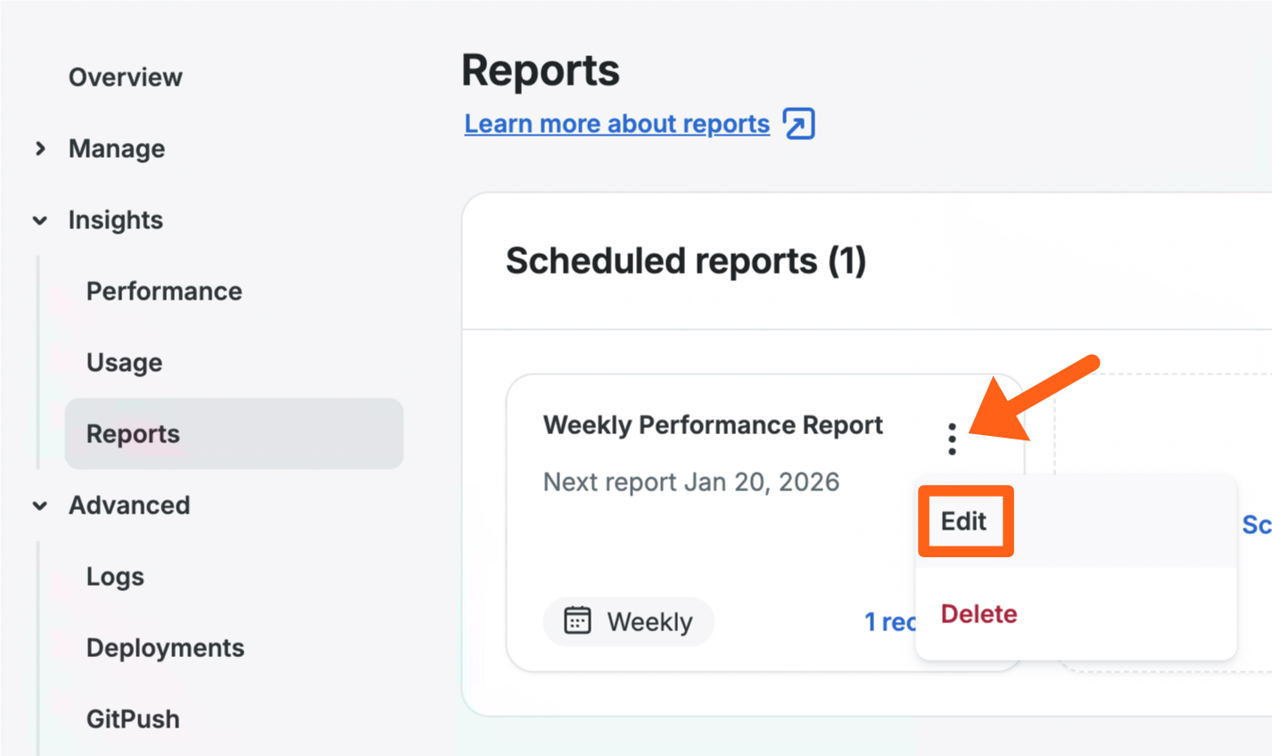 To edit a Site Report, simply click on the three dot menu icon in the top right of the card for a report under Scheduled reports and select Edit. You’ll have the option to update the pages included in the report as well as the frequency, recipients and schedule date for the report.