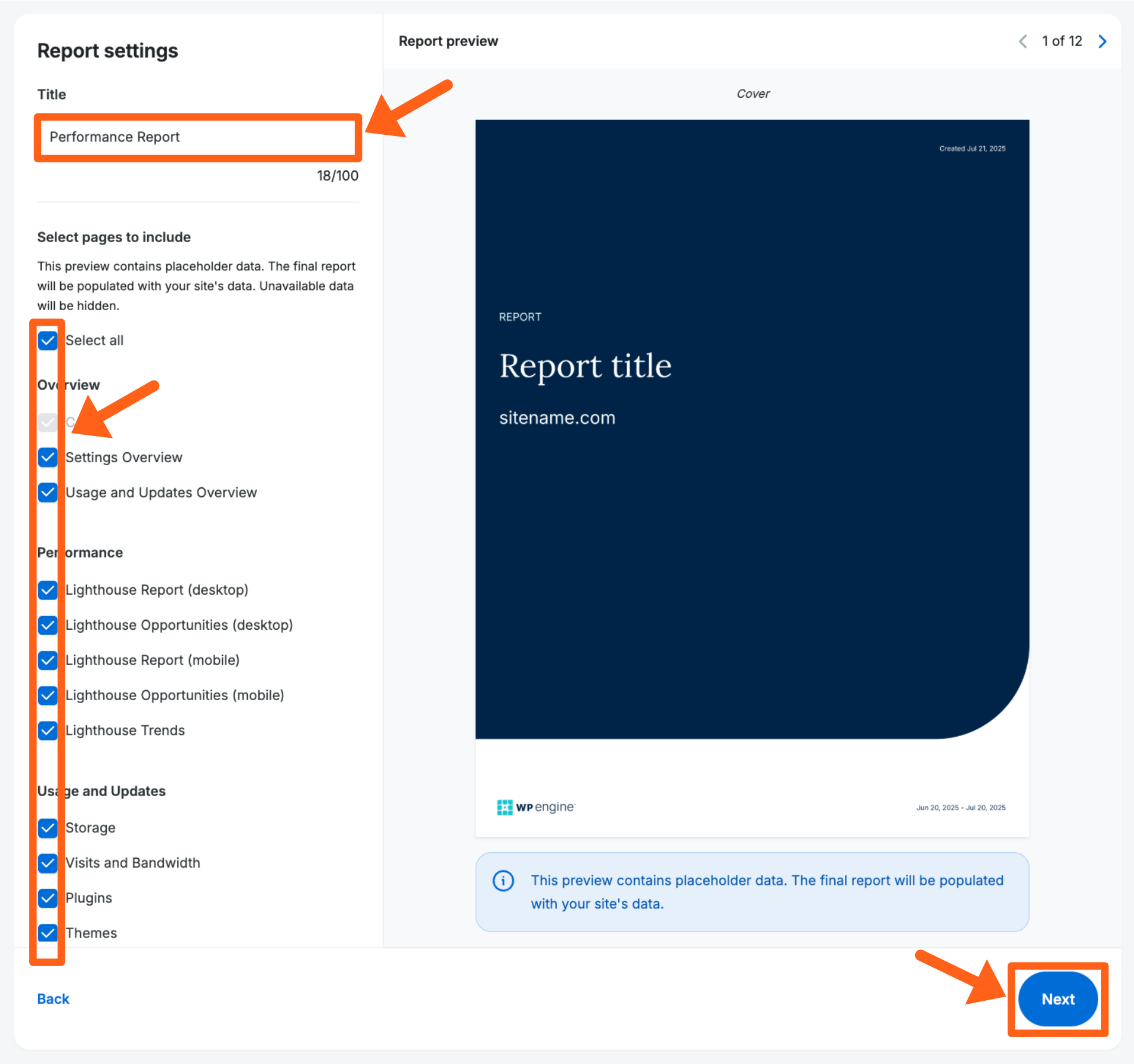 - Recipients: You can select up to 20 people who have access to your environment within the WP Engine User Portal to receive this report.