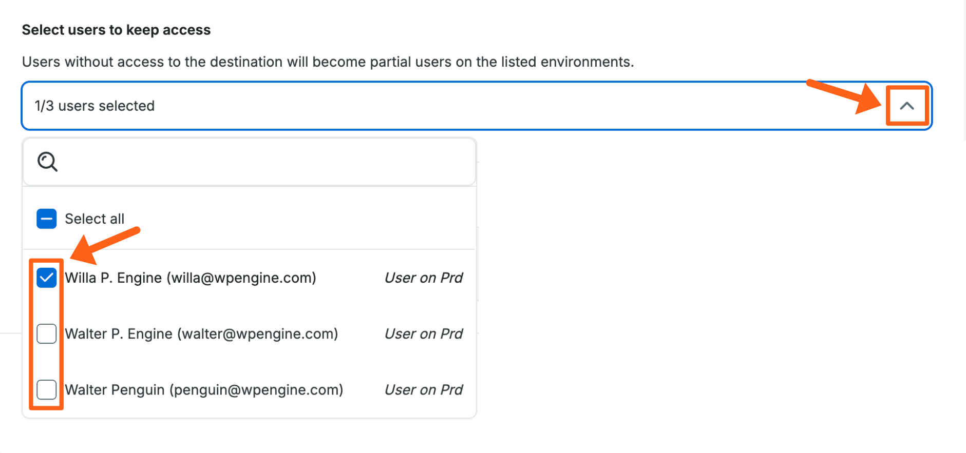 - Select users to keep access – Select users that you want to retain access to the site on the new account. All users with access to the site on the source account will be shown in the dropdown list. If any of the selected users do not yet have access to the destination account, they will be added as a Partial user and granted access to just the site being transferred. If a user already has Full or Owner access to the destination account, then it doesn’t matter if they are selected in the dropdown. They will retain their current user level on the destination account and have access to the site.