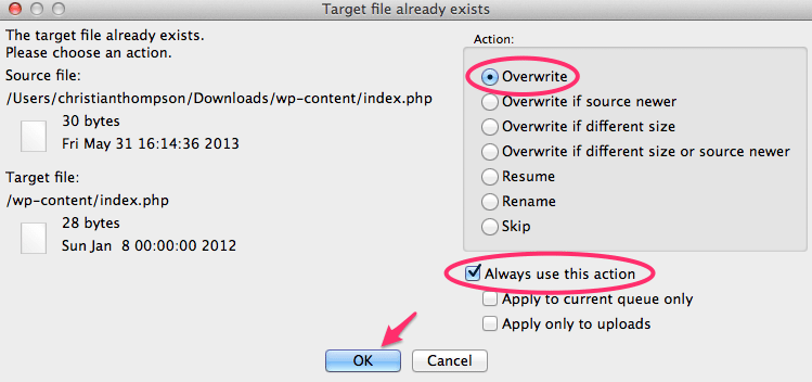 - You’ll be prompted to confirm that you want to overwrite, or merge, the existing files. There will be many files that will need to be overwritten, so you’ll want to check the box for “Always use this action option” (as shown below).