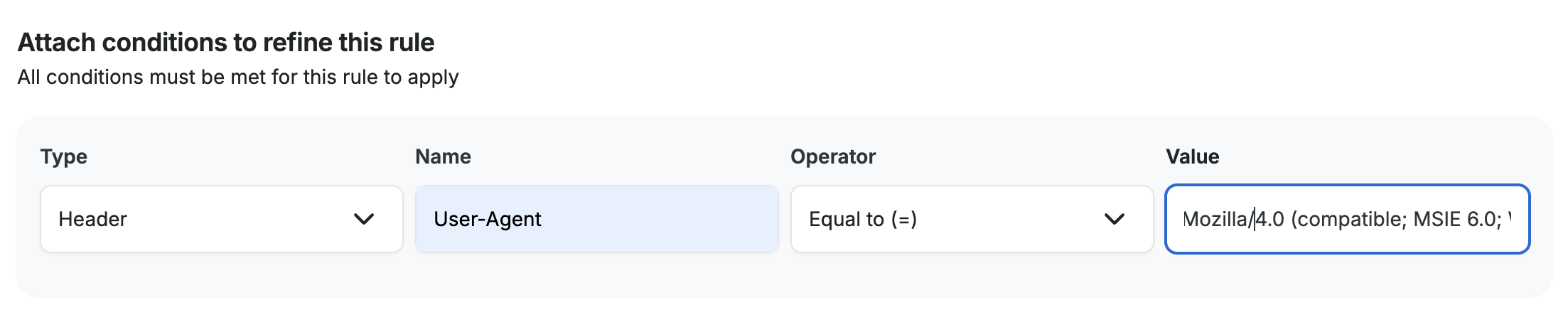 When you select a specific domain name, it will be added to the rule as an And-condition as shown in the screenshot below. It uses theHeader=HOSTcondition to apply the domain name condition to the rule.