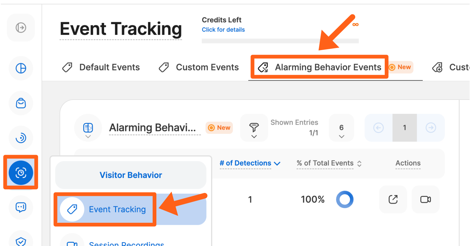 Alarming Behavior Events Tracking (ABEs) is a set of automatically monitored visitor actions that indicate poor user experience, such as Rage Clicking, Dead Clicks, Excessive Scrolling, and Rapid Page Reloading. This feature identifies these critical behaviors, offers visualization options (line chart or pie chart), and links directly to pre-filtered session recordings, allowing you to pinpoint and fix bugs or design flaws that frustrate visitors.