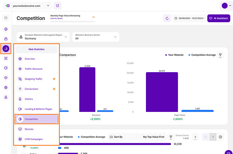 The Competition submodule allows you to compare your website’s performance data, such as visitors, page views, and device usage, against the respective averages of competing websites in a self-selected region and business sector. After defining your own site’s and competitors’ sectors, the platform calculates average metric values from its database, providing a visual comparison to help you identify areas for improvement.