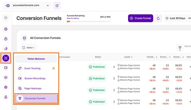 Conversion Funnels allow you to map multi-step visitor journeys and measure the drop-off rate between defined stages, with a session counting as converted if the steps are completed in the correct order. You can define funnel levels based on criteria like page visits or event triggers (including e-commerce and alarming behavior), and for any session that drops out, you can view the corresponding recording to identify the cause.