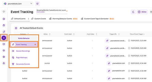 Event Tracking captures both automatically tracked standard events and manually-defined custom events, allowing you to monitor precisely how often visitors trigger specific actions on your website over time. This feature provides a detailed overview of all tracked events, a line diagram visualization, and the ability to create custom event tags to measure unique visitor interactions.