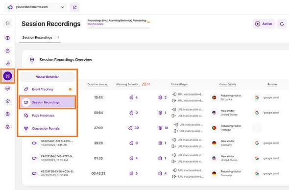 The Session Recordings feature captures video-like replays of visitor sessions, enabling you to visually see all actions, including clicks, scrolling, and content viewing patterns, exactly as the visitor experienced them. Analyzing these recordings helps to identify how visitors interact with your website, allowing for a thorough understanding of user journeys and for optimizing the site for a better overall experience.