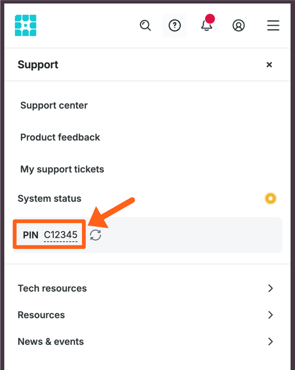 After clicking the question mark icon, you’ll see your support pin in the mobile menu as shown in the example screenshot below.